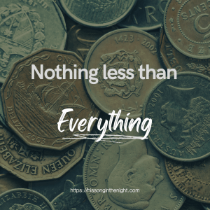 And then I considered the cost Jesus paid for me to have a relationship with Him. He poured out riches, honor, comfort, uncontainable glory, and His life to the very last drop of blood, to offer an eternal friendship with a sinner such as I. His offer of relationship with Him does come with a requirement. To follow Him requires nothing less than everything.